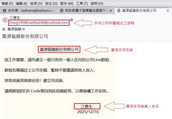 近日敝司發現.有不肖人士冒用本司及本司負責人名義.以非本公司郵件網址之信箱.散佈要求個人進行不知原因的操作行為(如圖所示).並回傳聯絡方式等異樣狀況.